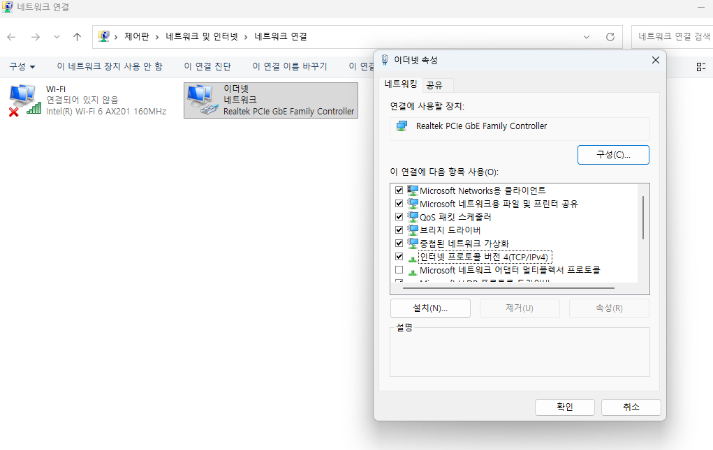 - 속성을 선택한 뒤 인터넷 프로토콜 버전 4(TCP/IPv4)를 선택합니다.