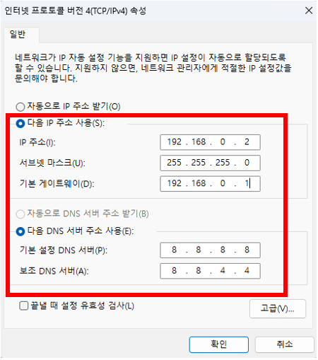 Windows에서는 다음 방법으로 DNS 설정을 확인할 수 있습니다.(IP설정과 동일)