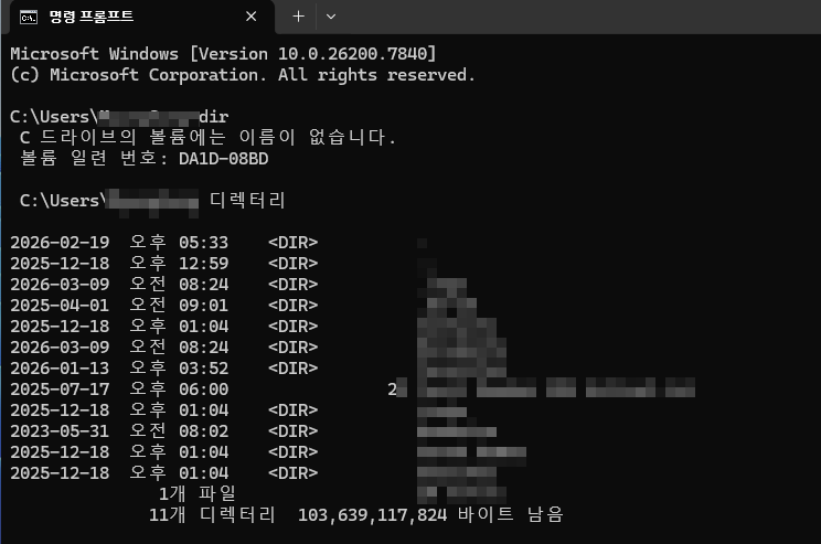 dir 명령어는 현재 폴더 안에 있는 파일과 하위 폴더 목록을 확인할 때 사용하는 명령어입니다.