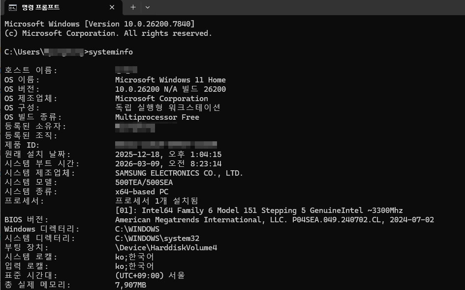 systeminfo 명령어는 Windows 시스템 정보를 확인할 수 있는 CMD 명령어입니다.
