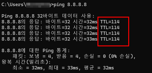 ping 명령어를 실행하면 응답 패킷과 함께 TTL 값이 표시됩니다.